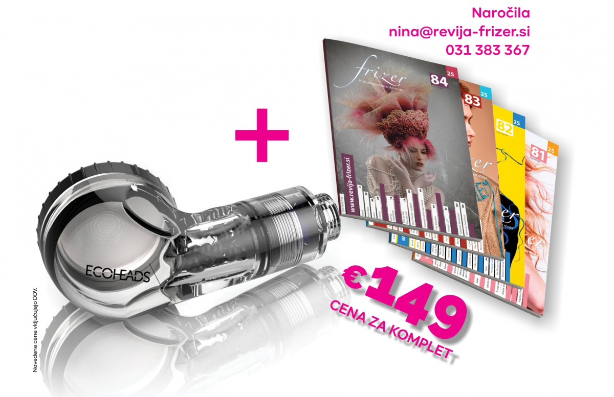V kompletu prejmete Ecoheads Showerhead X in letno naročnino na revijo Frizer. Vse skupaj za 149 €. DDV je vključen.